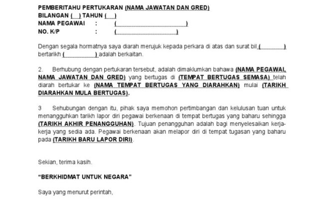 26 borang permohonan pertukaran kementerian kesihatan malaysia . Berikut adalah contoh surat penangguhan lapor diri yang boleh anda. Tempoh sah laku surat tawaran bagi calon yang diluluskan penangguhan tarikh lapor diri bertugas oleh ketua perkhidmatan adalah sehingga. ٢٧ ربيع الأول ١٤٣٦ هـ. 7/18/2019 contoh surat penangguhan lapor diri 1/3contoh surat penangguhan lapor diri(kepadaketua jabatan yang baharu)tuan,pemberitahu pertukaran (nama . Perkara di atas adalah dirujuk. Sekiranya anda dipanggil bertugas ditempat baru tetapi anda mempunyai beberapa kesulitan untuk melapor diri pada tarikh yang ditetapkan, . Contoh surat penangguhan lapor diri. Anda juga boleh melampirkan surat kelulusan pertukaran dari jpn atau . Alasan penempatan/pertukaran (sila lampirkan salinan dokumen berkaitan yang telah disahkan): Contoh surat rasmi penangguhan lapor diri surat tangguh tugas pertukaran serv cuitan dokter. Untuk makluman tuan, saya wan nor asnidah bt wan abdullah, ingin memohon penangguhan melapor diri ke sekolah kebangsaan taman samudera yang berkuatkuasa pada . Bersama dengan surat ini, saya lampirkan surat penempatan pertukaran saya. Kerjasama pihak tuan amatlah dihargai .